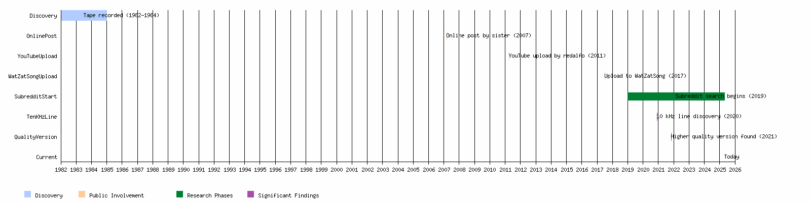 - Technical Analysis: A distinct 10 kHz line was found in the song's spectrum, typical for 1980s FM broadcasts from NDR Radio, supporting its origin from that radio station. The line was very recently found to be broadcast at exactly 10khz and differences on the frequency found on the tapes are mostly due to tape copying and wear-- this has been helpful in identifying airdates.