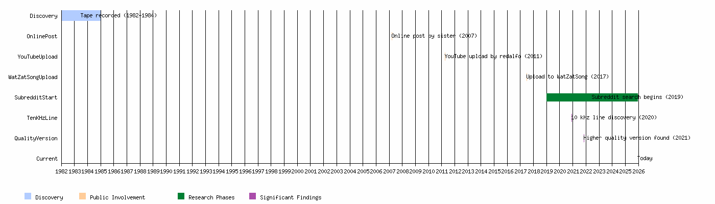 - Technical Analysis: A distinct 10 kHz line was found in the song's spectrum, typical for 1980s FM broadcasts from NDR Radio, supporting its origin from that radio station. The line was very recently found to be broadcast at exactly 10khz and differences on the frequency found on the tapes are mostly due to tape copying and wear-- this has been helpful in identifying airdates.