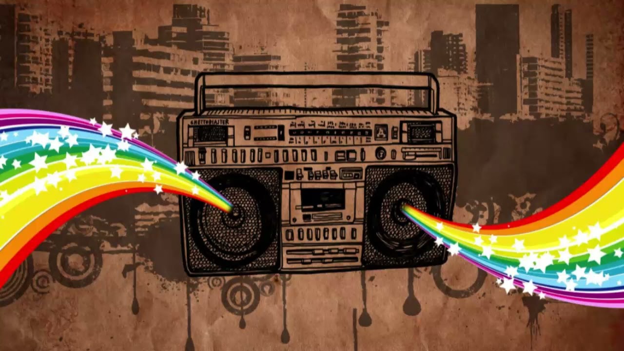 A brown boombox with rainbows and stars coming out of it, on a brown background.