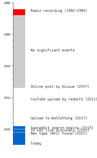On July 9th, 2020, reddit user u/FlexxonMobil received a list of every song Paul Baskerville played on Musik für Junge Leute from 1982 to 1984[36], but after searching through the available playlists[37], the song could not be found, even after receiving the partial 1984 playlists from other shows including Der Club and Nachtclub.[38] Through this, searchers were able to estimate that the song aired in September or November 1984 based on several discovered playlists containing songs Darius had to have recorded during that time period.[39] There are still several missing Nachtclub and Der Club playlists that could contain the song, spanning August to October 1984.[40]